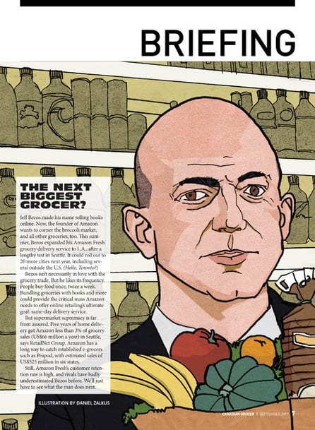 07. October 2013 Jeff Bezos for Canadian Grocer I recently did a portrait illustration of Jeff Bezos for Canadian Grocer Magazine. Bezos is looking to sell groceries through Amazon and has already started in a few markets. Check out my illustration above and in the current issue (September 2013). tagPlaceholderTags: Drawing, Portrait, Canadian, Grocer Write a comment Comments: 0