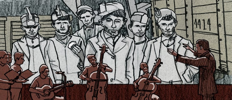 I like the mix of grays and the strong brown. Haven’t had a chance to read the article yet, but I get a sense that the musicians are set in the foreground of a movie or photo of the minors in the background. I can hear the music playing!